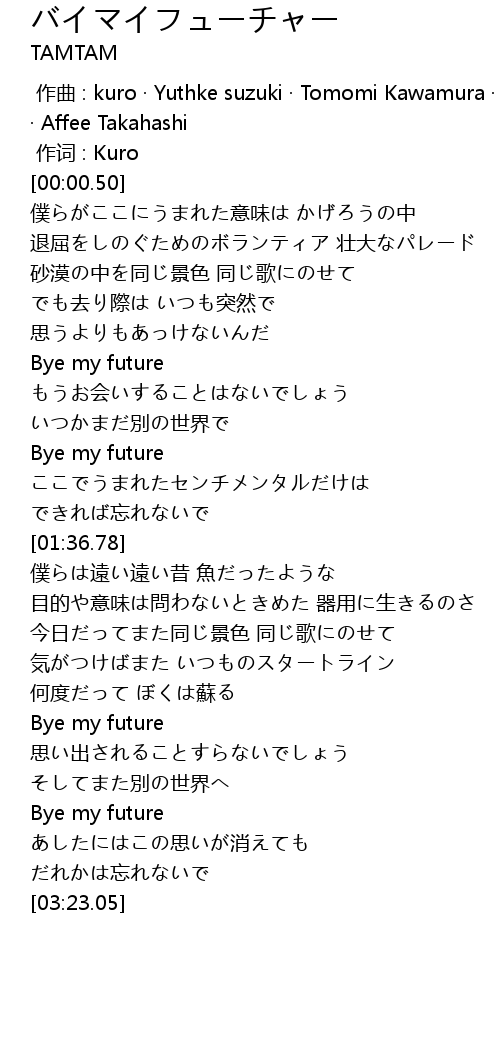 | [00:00.00] | zuo qu : kuro Yuthke suzuki Tomomi Kawamura Junet Kobayashi Affee Takahashi |