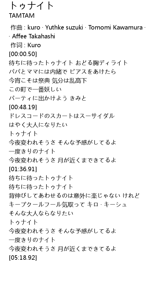 | [00:00.00] | zuo qu : kuro Yuthke suzuki Tomomi Kawamura Junet Kobayashi Affee Takahashi |
