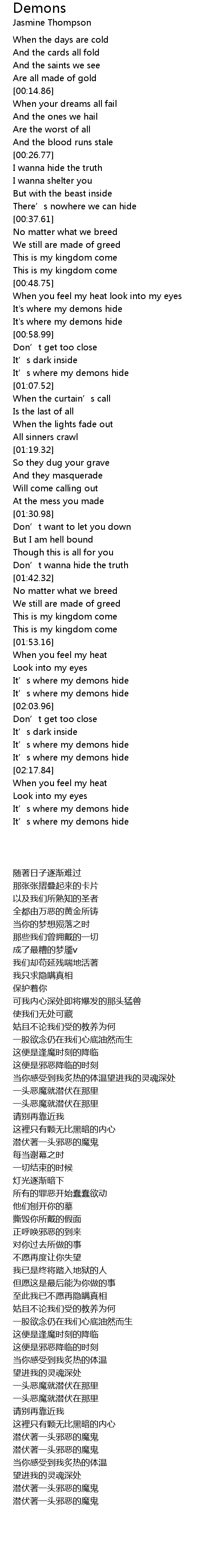 | [02:33.98] | It' s where my demons hide |