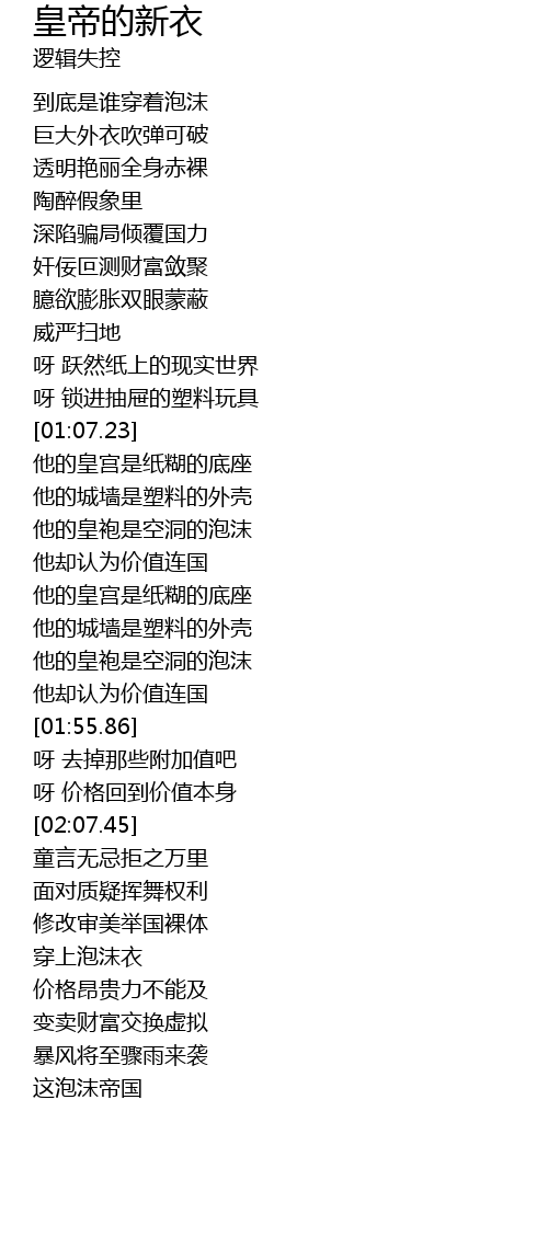 | [01:49.74] | 他的皇袍是空洞的泡沫 |