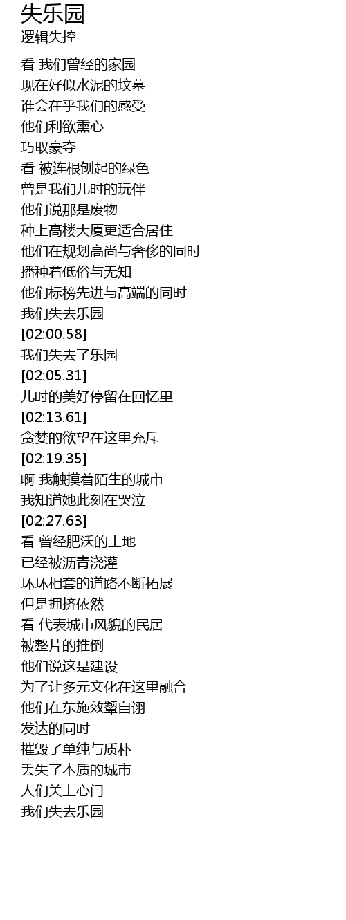 | [02:01.09] | wǒ men shī qù le lè yuán |