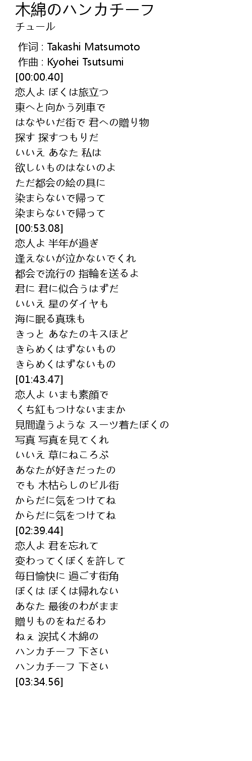 | [03:20.56] | ねぇ 涙拭く木綿の |