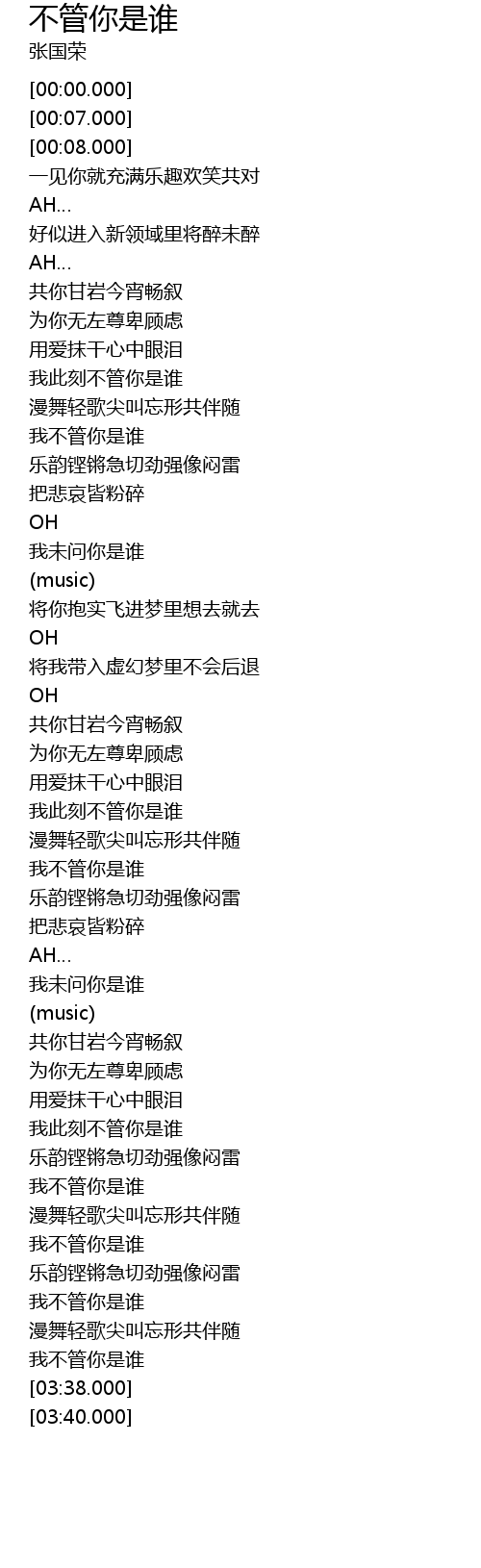| [03:08.000] | wǒ bù guǎn nǐ shì shuí |
