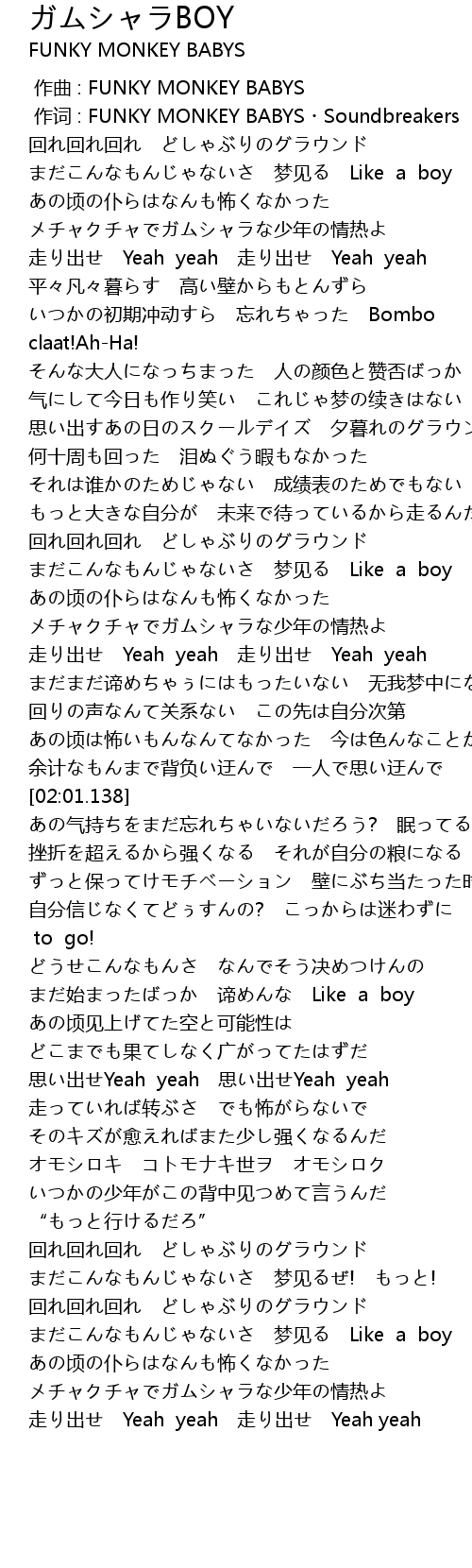 | [00:01.00] | 作词 : FUNKY MONKEY BABYS・Soundbreakers |