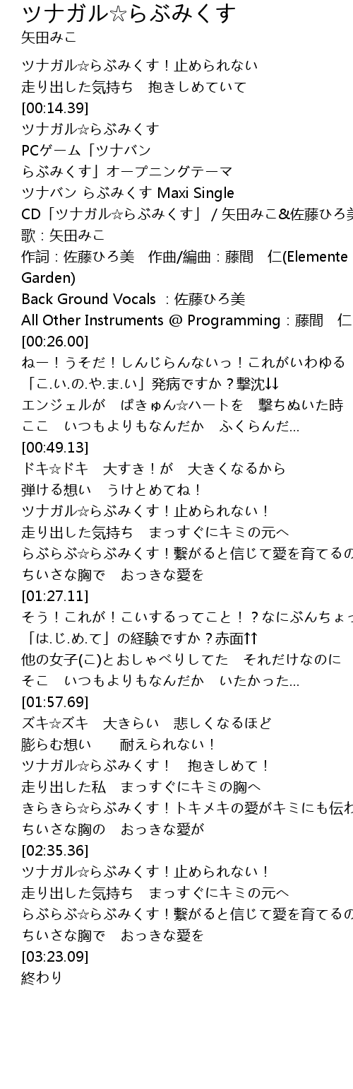 | [00:17.00] | PCゲーム「ツナバン らぶみくす」オープニングテーマ |