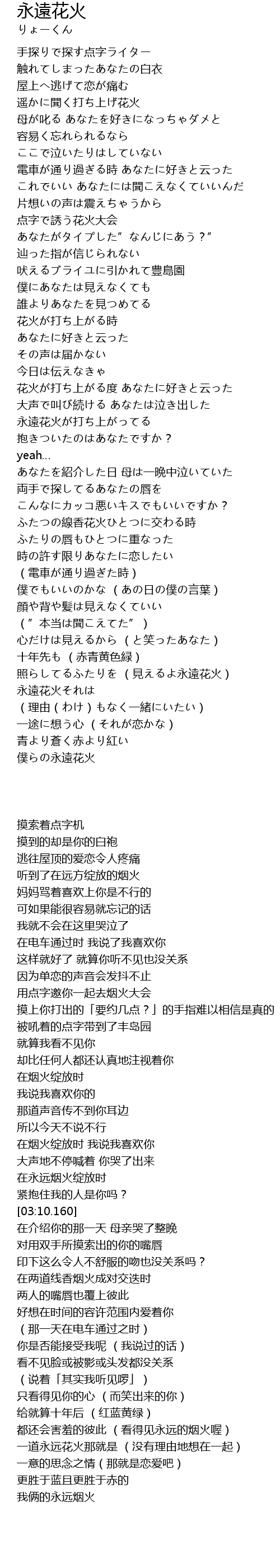 | [05:02.410] | 永遠花火それは (理由(わけ)もなく一緒にいたい) |