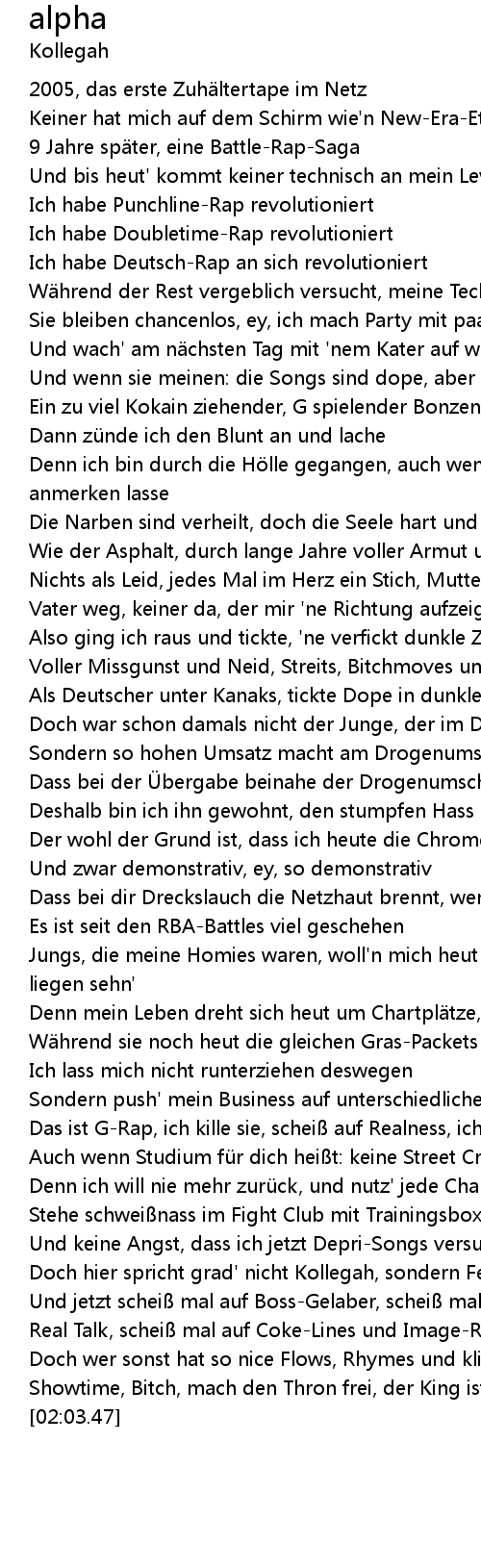 | [00:35.92] | Und wenn sie meinen: die Songs sind dope, aber der Typ ansonsten bloß |
