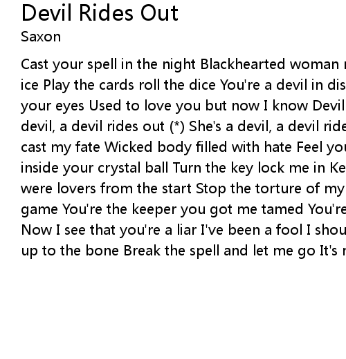Cast your spell in the night Blackhearted woman mistifies Heart of stone cold as ice Play the cards roll the dice You're a devil in disguise I see the evil in your eyes Used to love you but now I know Devil woman won't let go She's a devil, a devil rides out (*) She's a devil, a devil rides out Spin the wheel cast my fate Wicked body filled with hate Feel your power in my soul Trapped inside your crystal ball Turn the key lock me in Keep me hungry for your sin We were lovers from the start Stop the torture of my heart I'm the loser in the game You're the keeper you got me tamed You're the priestess with eyes of fire Now I see that you're a liar I've been a fool I should have known You were evil up to the bone Break the spell and let me go It's not a secret anymore |