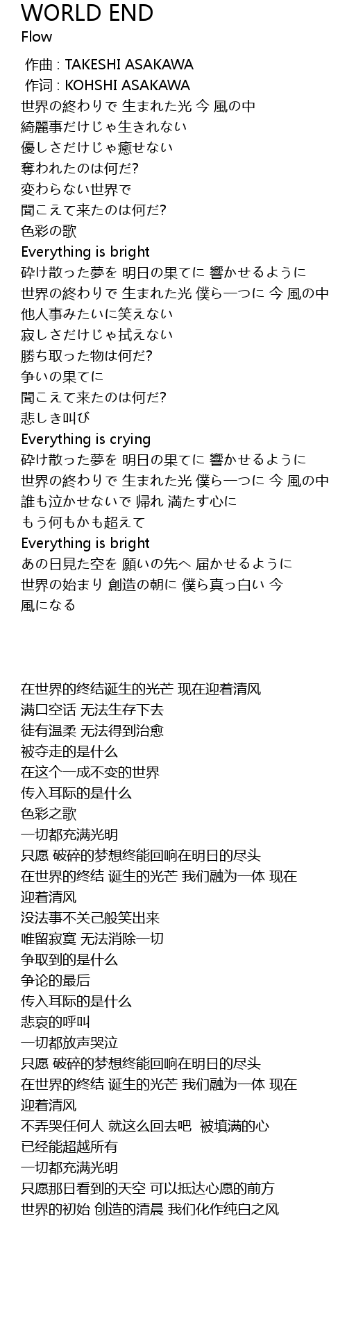 | [00:02.660] | 世界の終わりで 生まれた光 今 風の中 |