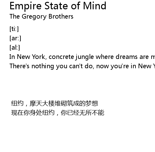 | [00:00.36] | In New York, concrete jungle where dreams are made, oh |