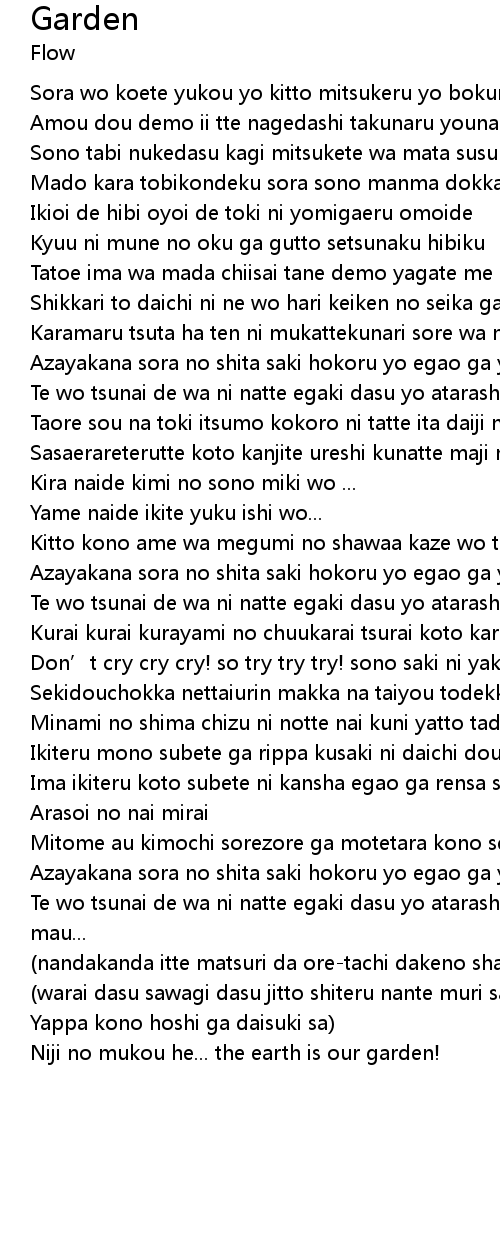 | Sora wo koete yukou yo kitto mitsukeru yo bokura no rakuen wo | |