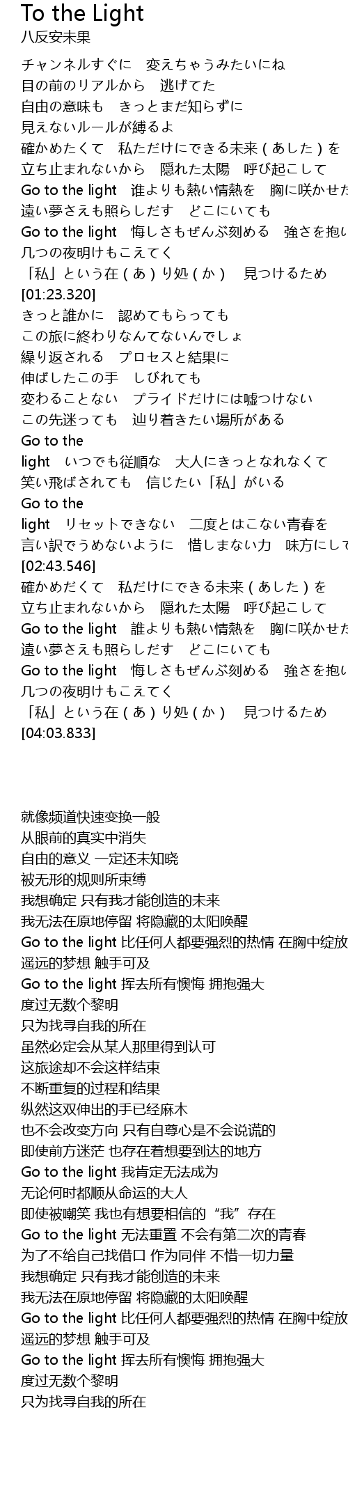 | [01:05.772] | Go to the light 悔しさもぜんぶ刻める 強さを抱いて |
