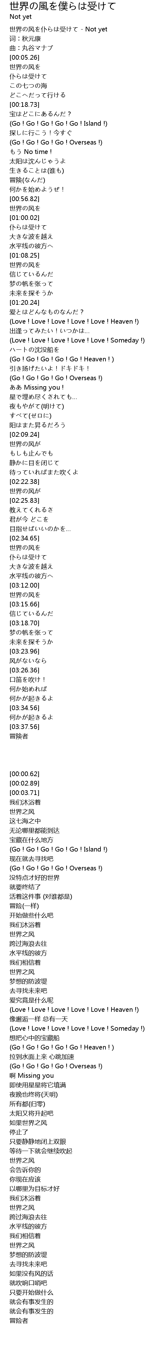 | [00:00.62] | 世界の风を仆らは受けて - Not yet |