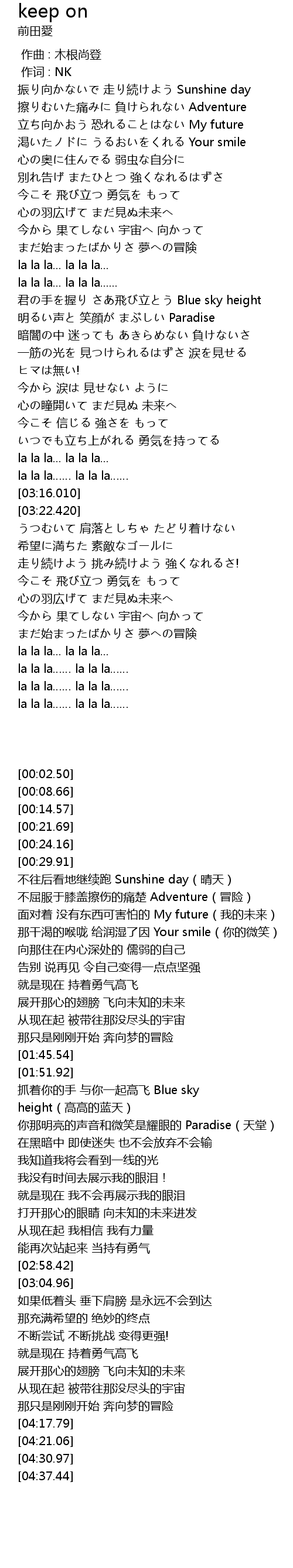 | [03:41.060] | 走り続けよう 挑み続けよう 強くなれるさ! |