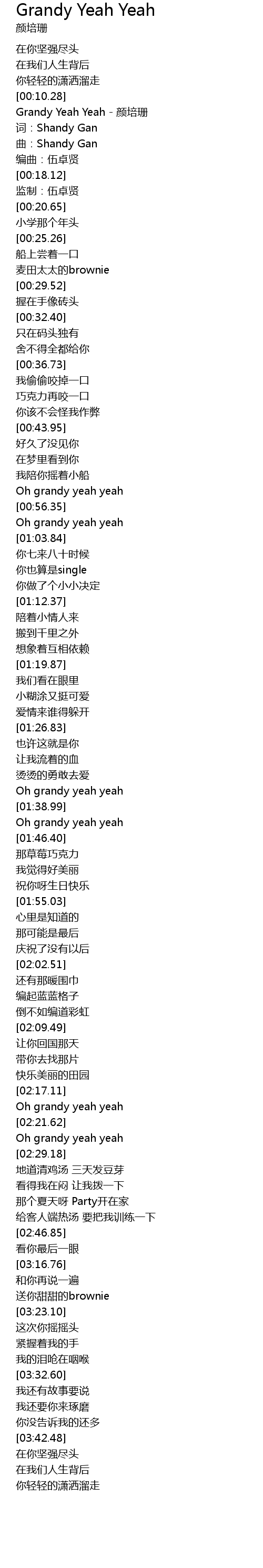 | [00:11.37] | Grandy Yeah Yeah yán péi shān |