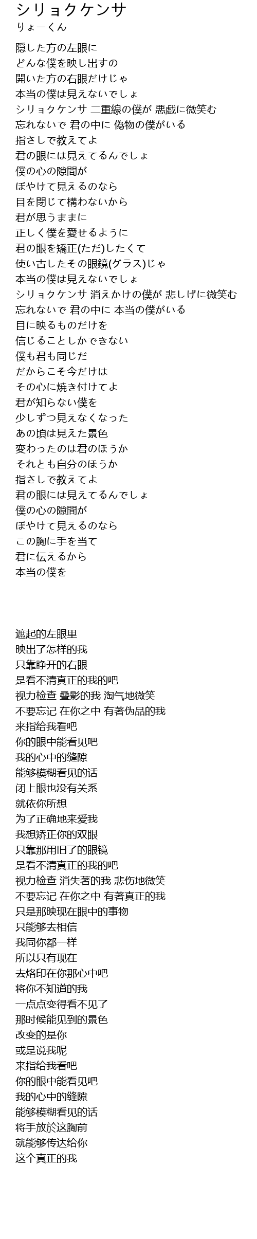 | [00:36.79] | シリョクケンサ 二重線の僕が 悪戯に微笑む |