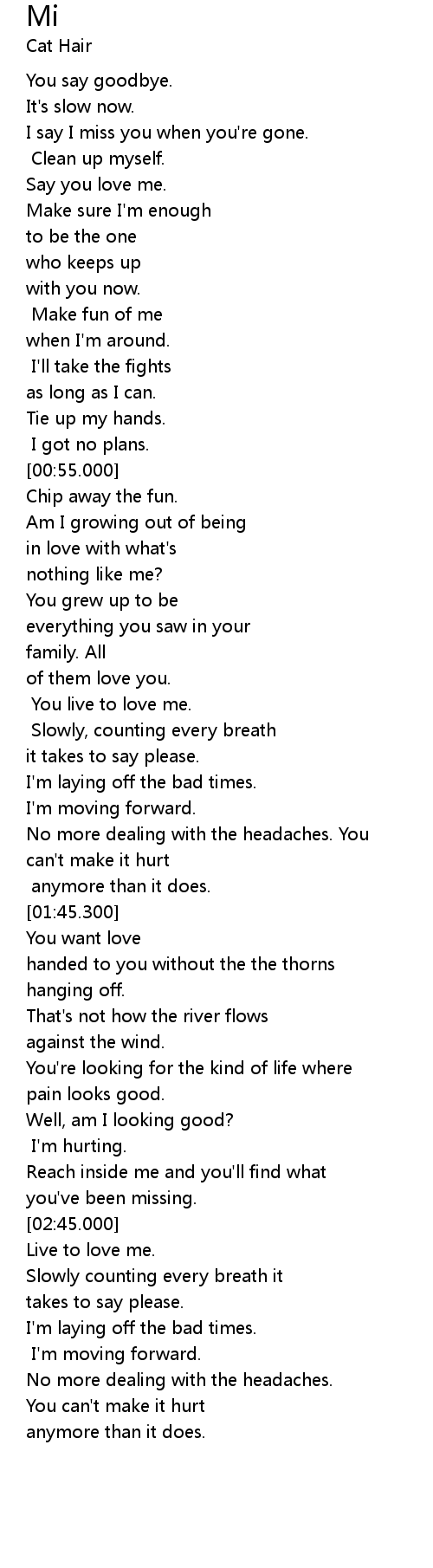 | [03:05.000] | Slowly counting every breath it |