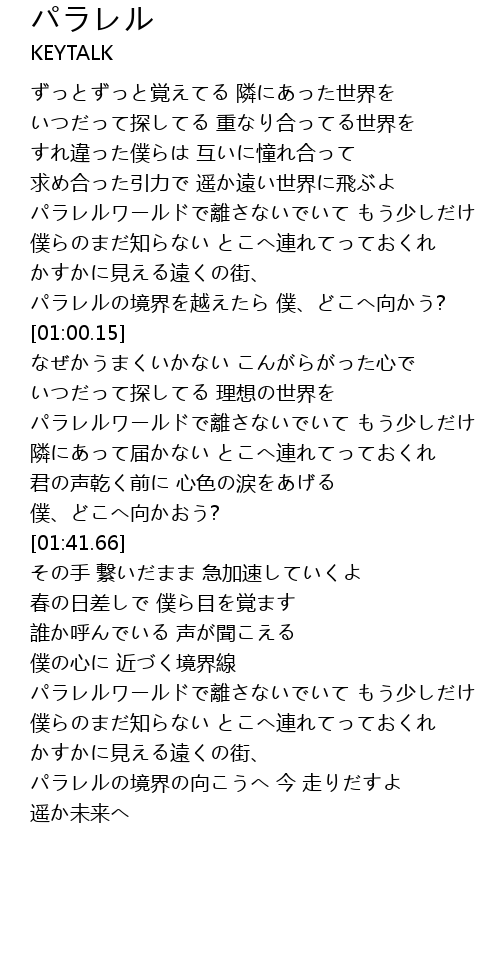 | [00:40.32] | パラレルワールドで離さないでいて もう少しだけ |