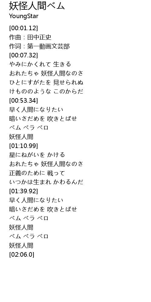 | [01:26.77] | おれたちゃ 妖怪人間なのさ |