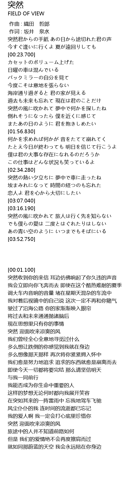 | [00:01.240] | 突然君からの手紙 あの日から途切れた君の声 |