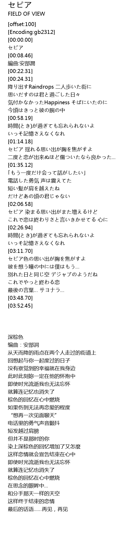 | [02:06.59] | セピア 染まる思い出がまた増えるけど |