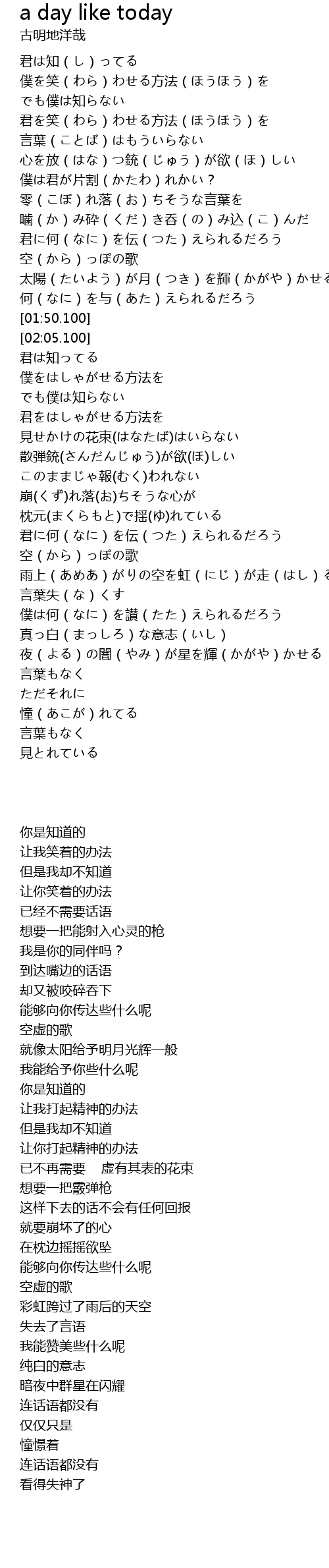 | [01:01.100] | 心を放(はな)つ銃(じゅう)が欲(ほ)しい |