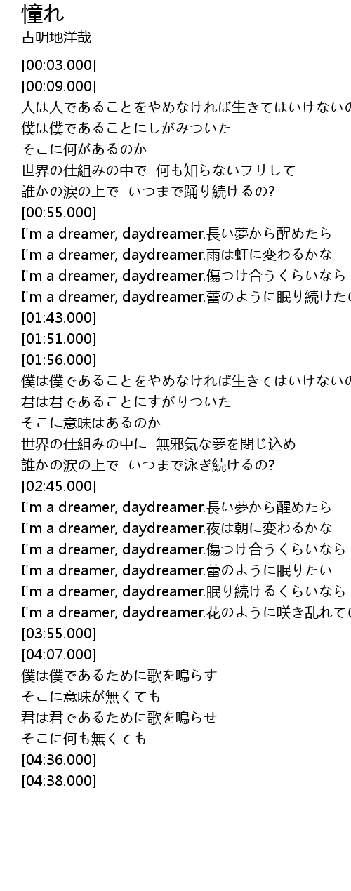 | [03:19.000] | I'm a dreamer, daydreamer.蕾のように眠りたい |