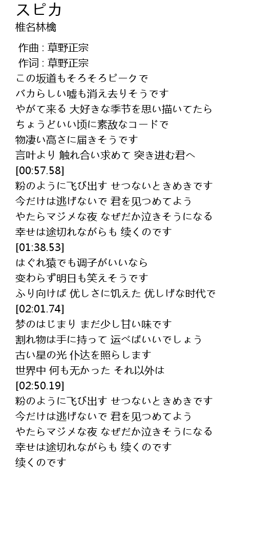 | [00:59.63] | 粉のように飞び出す せつないときめきです |