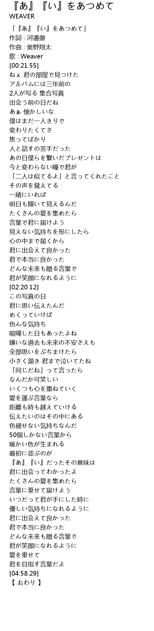 | [00:01.55] | 「『あ』『い』をあつめて」 |