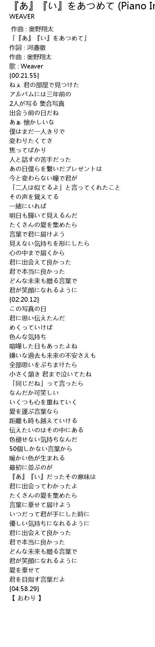 | [00:01.55] | 「『あ』『い』をあつめて」 |