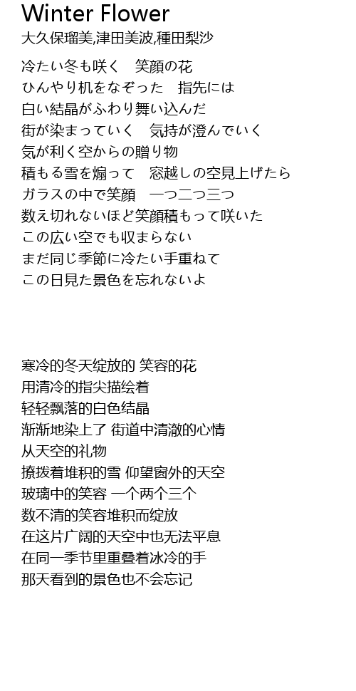 | [00:07.20] | 冷たい冬も咲く 笑顔の花 |
