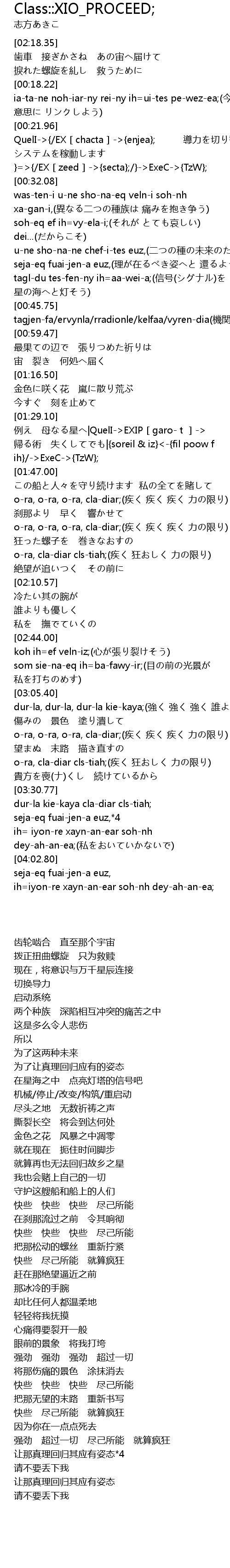 | [02:01.15] | o-ra, cla-diar cls-tiah;(疾く 狂おしく 力の限り) |
