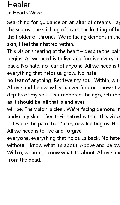 | Searching for guidance on an altar of dreams. Laying before death and torn at the seams. The stiching of scars, the knitting of bones, bound by the healers, the holder of thrones. We' re facing demons in the dark I feel them under my skin, I feel their hatred within. | |