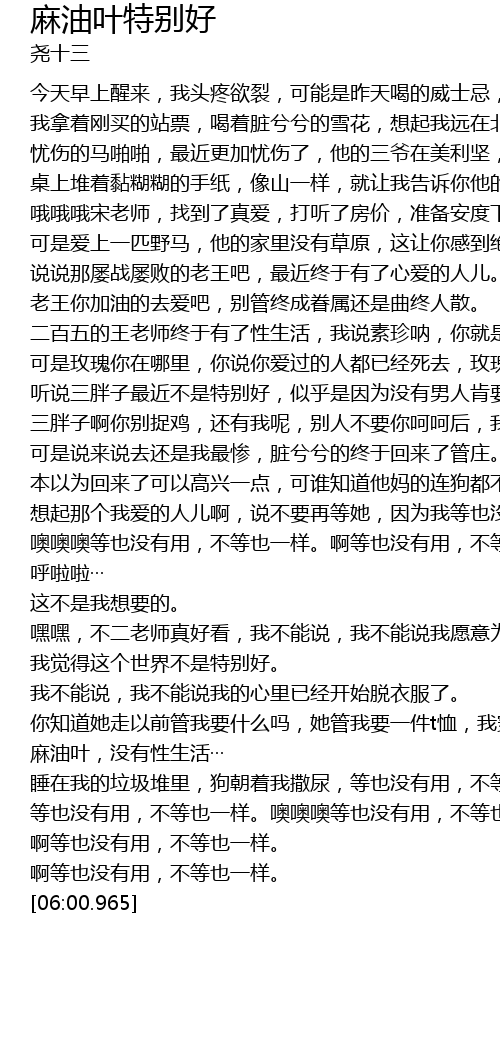 | [00:48.759] | 桌上堆着黏糊糊的手纸,像山一样,就让我告诉你他的名字,他的名字,马小山。 |