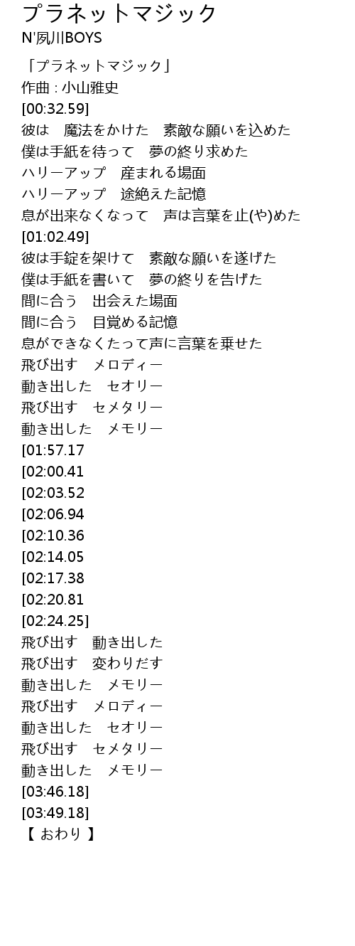| [03:39.39][02:17.38] | プラネットマジック スタイルなんて |