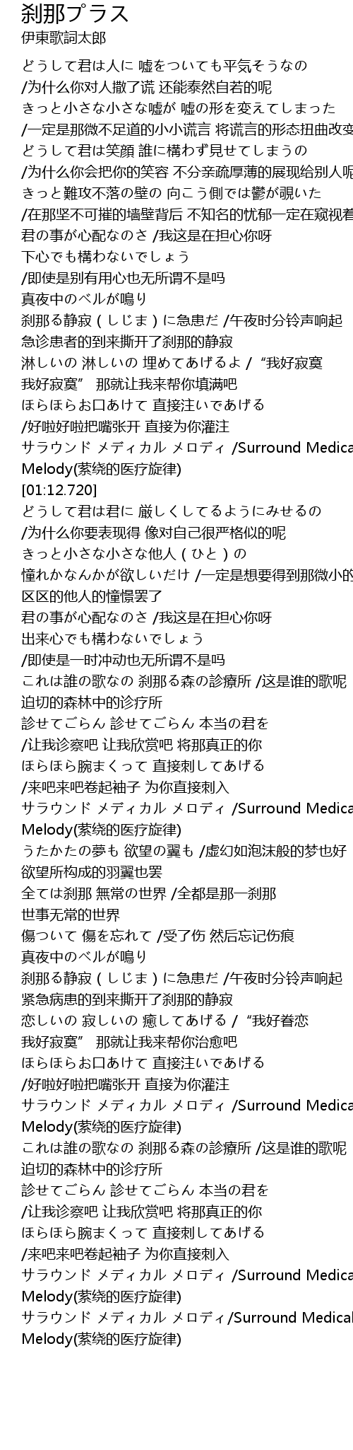 | [02:41.360] | 真夜中のベルが鳴り 刹那る静寂(しじま)に急患だ /午夜时分铃声响起 紧急病患的到来撕开了刹那的静寂 |