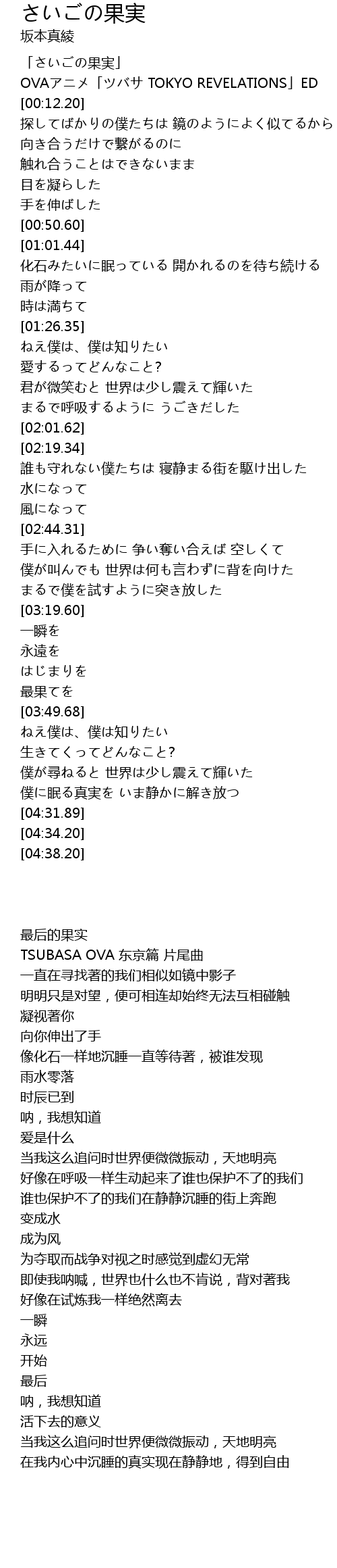 | [00:04.20] | OVAアニメ「ツバサ TOKYO REVELATIONS」ED |