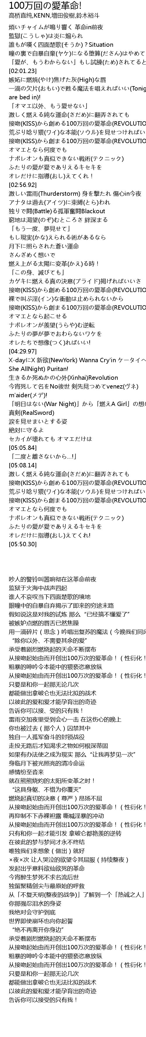 | [05:15.52] | 接吻(KISS)から創める100万回の愛革命(REVOLUTION)!(性Evolution!) |