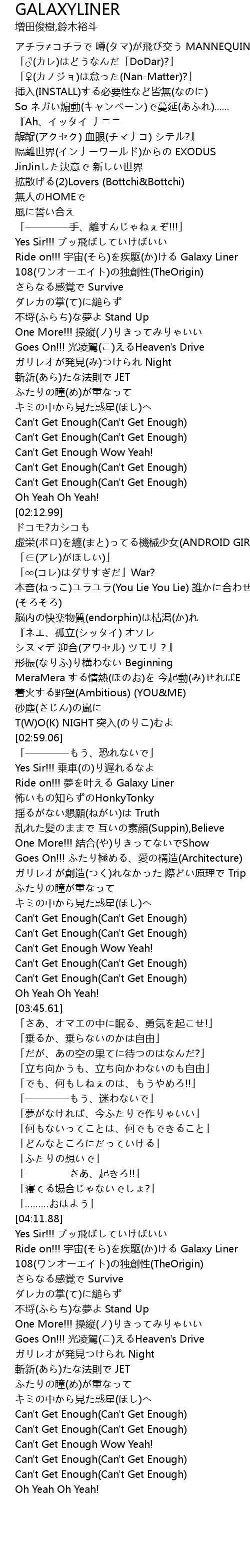 | [04:16.54] | Ride on!!! 宇宙(そら)を疾駆(か)ける Galaxy Liner |
