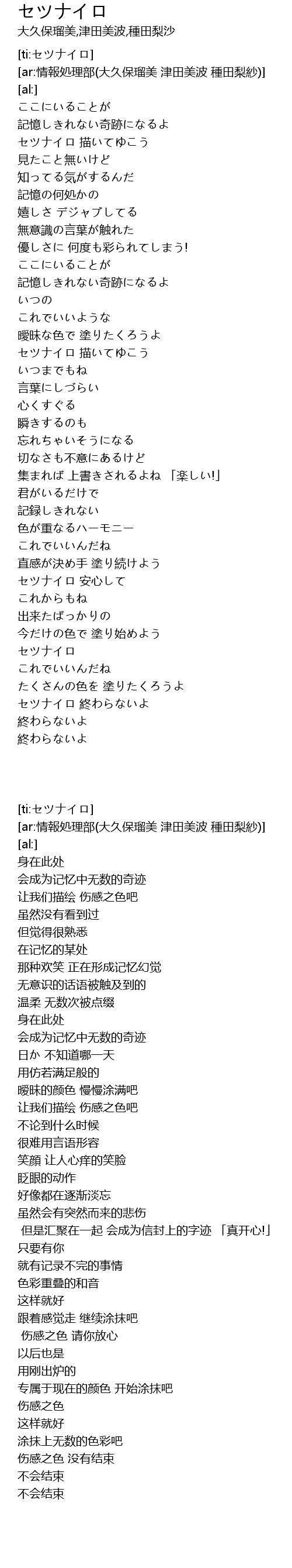 | [03:19.73] | セツナイロ 終わらないよ |