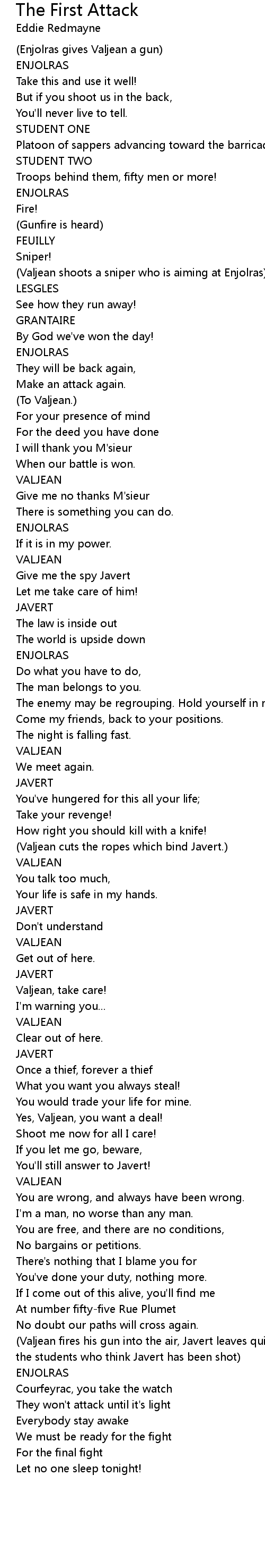 (Valjean fires his gun into the air, Javert leaves quickly. Muted applause from the students who think Javert has been shot)