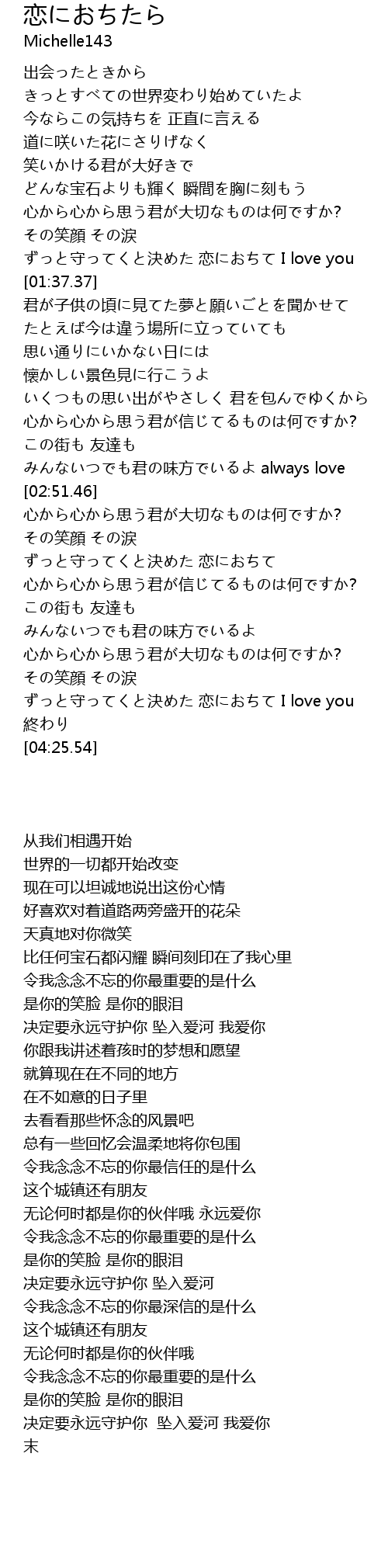 | [04:08.75] | ずっと守ってくと決めた 恋におちて I love you |