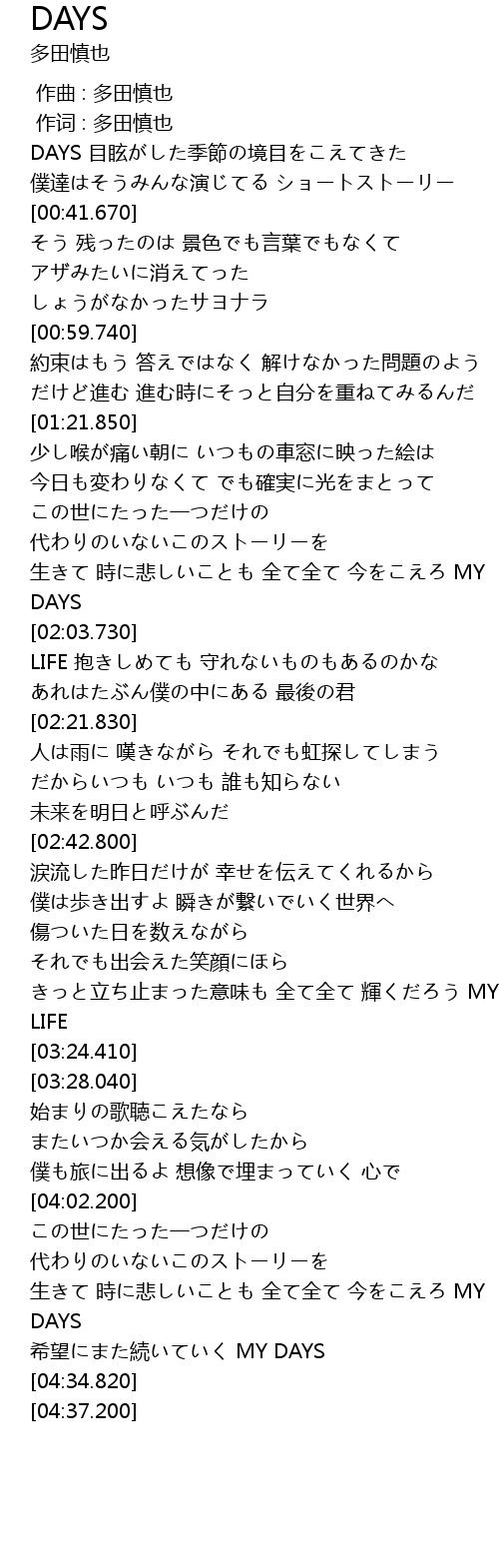 | [04:11.400] | 生きて 時に悲しいことも 全て全て 今をこえろ MY DAYS |