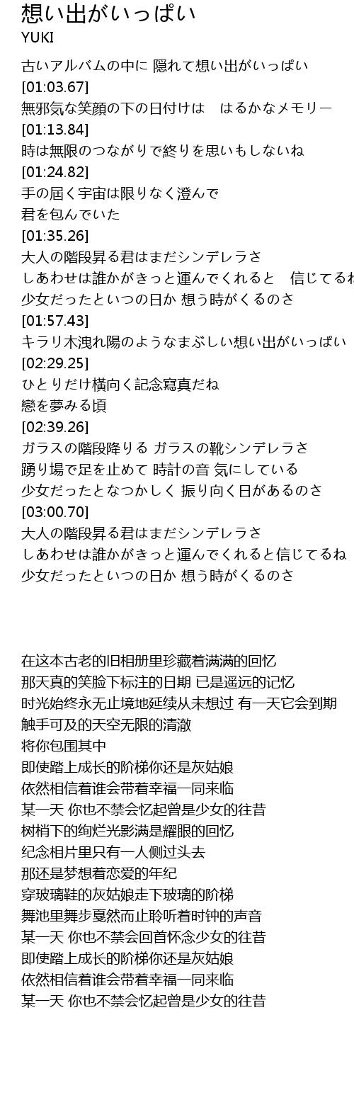 | [00:54.09] | 古いアルバムの中に 隠れて想い出がいっぱい |