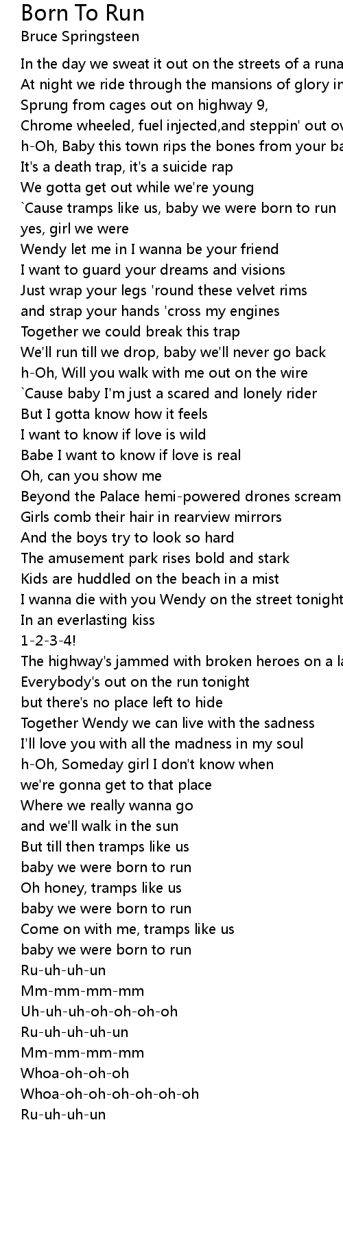 `Cause tramps like us, baby we were born to run |