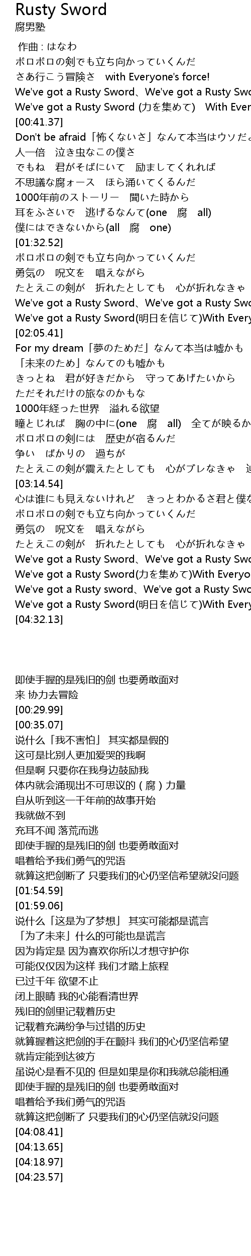 | [04:23.57] | We' ve got a Rusty Sword míng rì xìn With Everyone' s Force! |