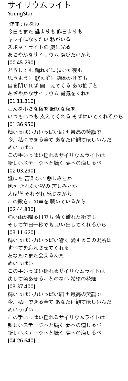 | [01:04.410] | あざやかなサイリウム 勇気をくれた |