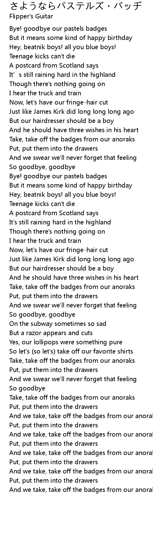 | [00:45.000] | Take, take off the badges from our anoraks |
