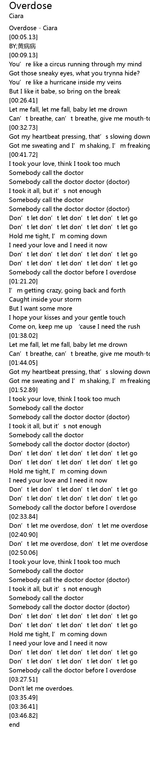 | [02:46.82] | Don' t let me overdose, don' t let me overdose |
