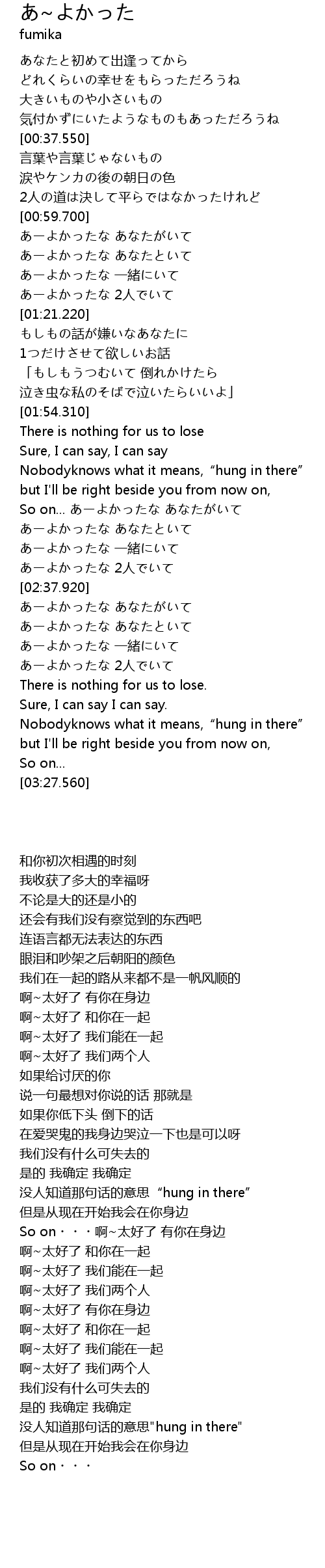 | [02:15.550] | So on... あーよかったな あなたがいて |